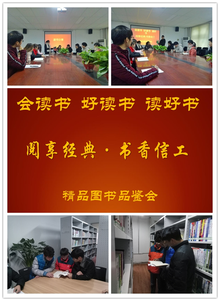 1月3日中午12点,信工学院在资讯楼104会议室开展以“阅享经典·书香信工”为主题的图书品鉴会,学艺部部长刘蕊、副部长胡澍、付旭阳及我院院部分读书爱好者参加此次品鉴会。