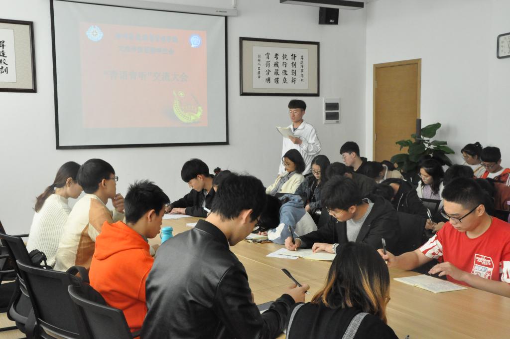 为增进团学干部对共青团工作的了解,增强团员青年的组织归属感和认同感,进一步坚定跟党走的理想信念,11月27日中午12点整,文法学院“青语青听”交流大会在一号楼314举行。本次交流会邀请了有丰富团学工作经验的文法学院上一届团委学生会干部参加,文法学院团委学生会全体学生干部和各班学生代表到场参加。