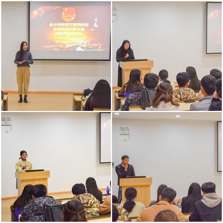 为提高学生干部管理班级的能力,加强班级凝聚力,11月29日晚6:30在四号楼成功举行了会计学院第五期团校班系列活动之优秀团干交流会。莅临本次大会的嘉宾有会计学院16级会电本一班团支书张玉博,17级会电本二班班长王月妍,17级财本一班团支书刘玉山,17级会本三班班长金文洁。