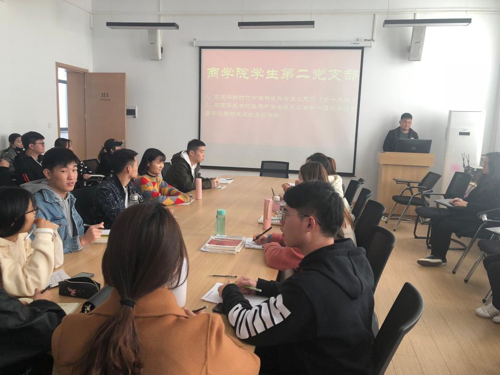 为了更好地贯彻习近平新时代中国特色社会主义思想理论,紧跟时代发展步伐,11月29日中午12点,商学院学生第二党支部全体党员、预备党员、积极分子在二号楼315会议室开展政治学习会议。会议由商学院学生第二党支部书记王楠老师主持。