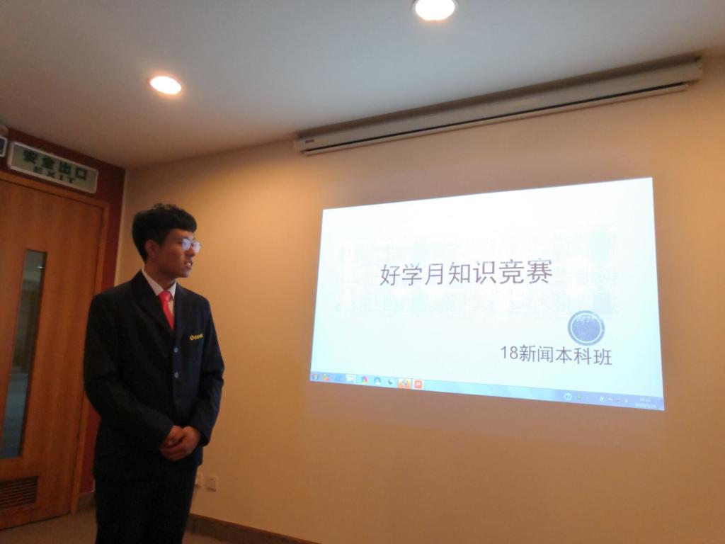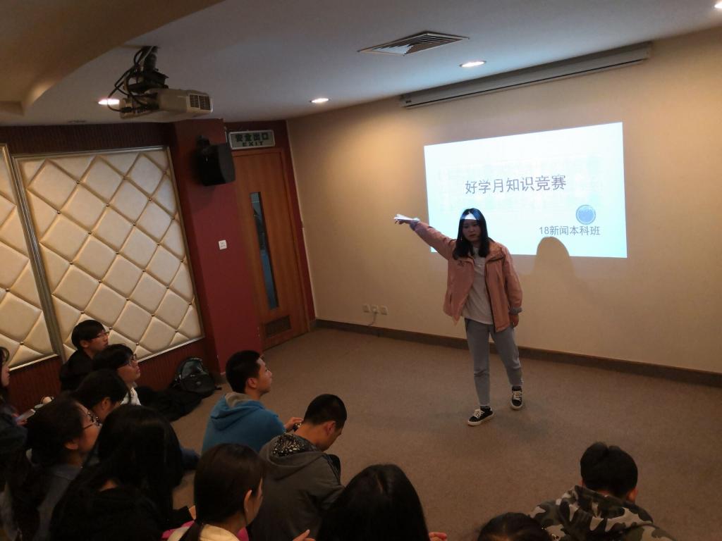4月4日上午10点30分,文法学院2018级新闻专业同学们在学生干部郭静雨、张帆、曹盈的带领下,在图书馆三楼顺利举办了好学月知识竞赛活动。