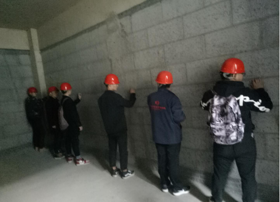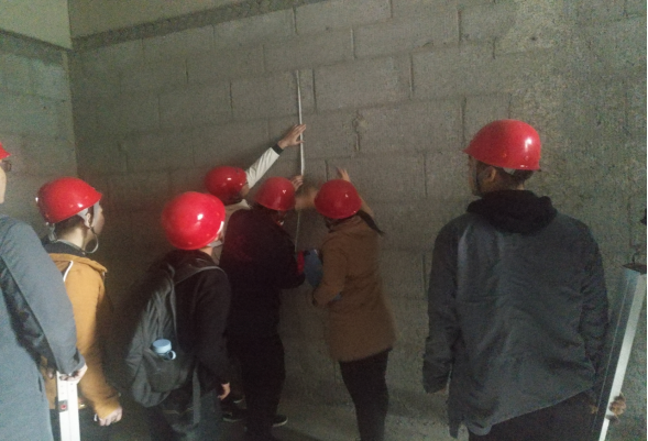 本项目为16级土木工程及18级土木升本专业《建筑工程质量检验与安全管理》课程实训内容。项目分为建筑工程质量检验和安全管理两大部分。在四位老师的指导下,带领学生走出去,下现场,充分利用我校34号宿舍楼建设项目,结合实验实训项目开展实验场所和施工现场对接的教学模式,极大的提高了学生对建筑工程质量检验与安全管理的认知。特别是砌体量测一般项目:轴线位移、墙面垂直度、墙面表面平整度、门窗洞口尺寸、灰缝厚度或宽度、墙体游丁走缝、搭接长度等检验技术操作,进一步理解了有关理论概念,而且掌握了充分的实践操作技能知识。