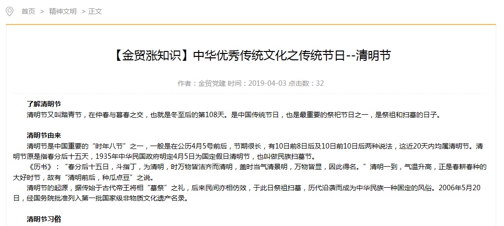 二是在学院党总支网站发布“金贸涨知识-中华优秀传统文化之传统节日”网络系列专题,本期主题为“清明节”,对清明节的背景、由来、习俗和古诗鉴赏等方面进行中华传统文化的宣传。