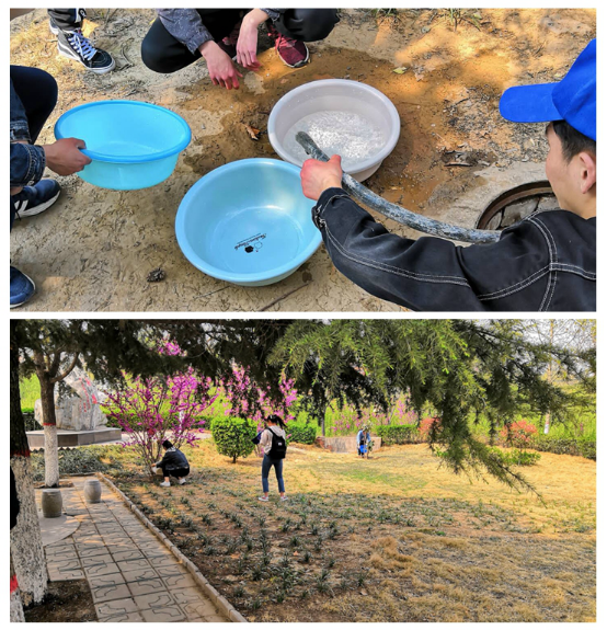 信工学院的“小蓝帽”们手拿水盆,铁锹等工具蓄势待命,时刻准备投入到活动中去,同学们分工明确,有人挖水槽,有人打水,有人培土……整个浇水现场,大家忙的不亦乐乎,一派热火朝天的劳动景象。