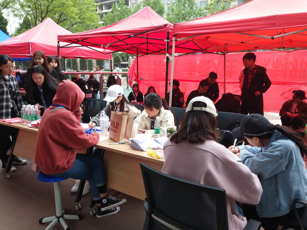 我校第21届运动会于4月25日上午在田径场隆重举行。外语学院志愿者们在运动会的学院服务大本营,做好后勤服务。