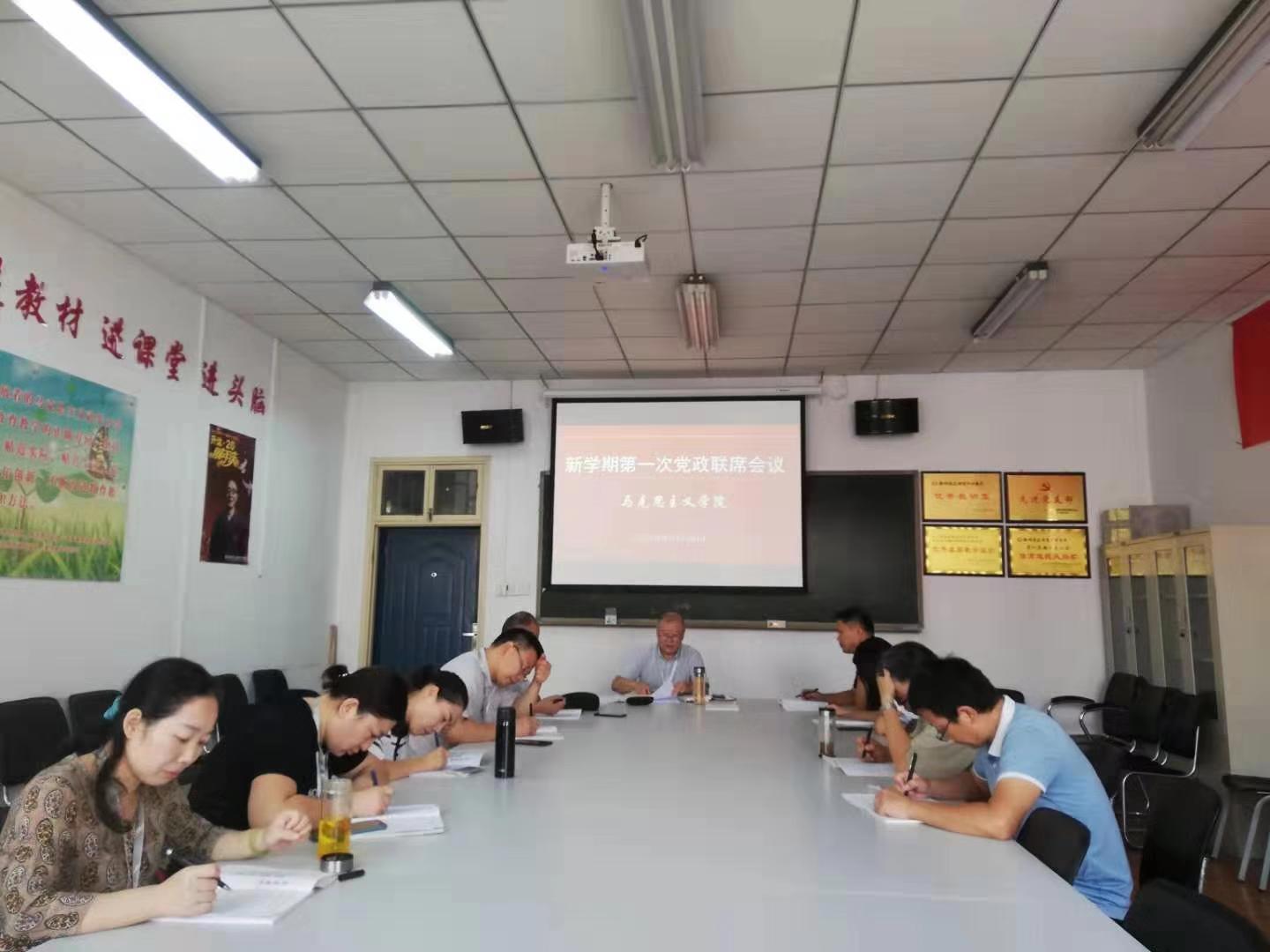 8月26日上午,新学期伊始,马克思主义学院在综合楼211会议室召开了新学期第一次党政联席会议,研究部署新学期各项工作。马克思主义学院院长朱慈华教授、直属党支部书记窦峰副教授、教学秘书晏玲玲老师、各教研室主任、教学督导刘树林教授、杨天佑副教授参加了本次会议。会议由朱慈华院长主持。