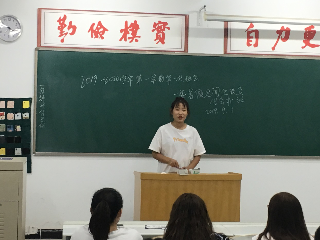 2019年9月1日2018级会计学院会计学班级在时金楼教室,召开2019-2020学期第一次班会暨暑假见闻座谈会。各班对上学期的工作进行了总结汇报,并提出本学期的奋斗目标。