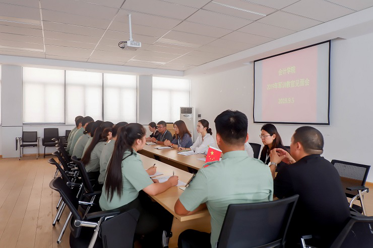 为使新生军训工作顺利进行,9月5日下午14:00,会计学院于4号楼209教室召开军训教官及辅导员见面会。会计学院院长张欣院长,会计学院行政秘书兼团委书记陈刚老师,会计学院团委副书记刘锦老师,2019级新生辅导员以及全体军训教官出席了此次见面会,会议由陈刚老师主持。