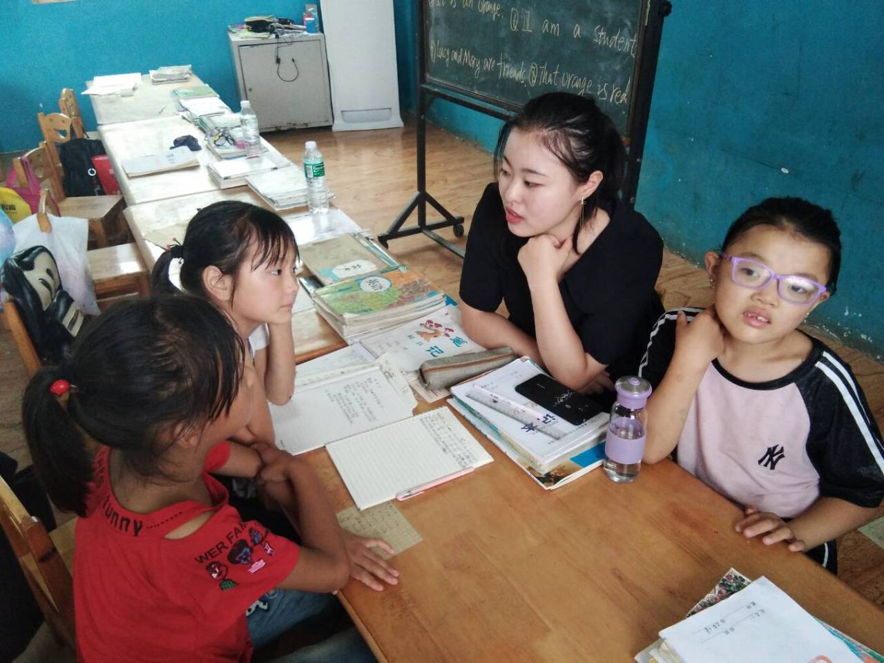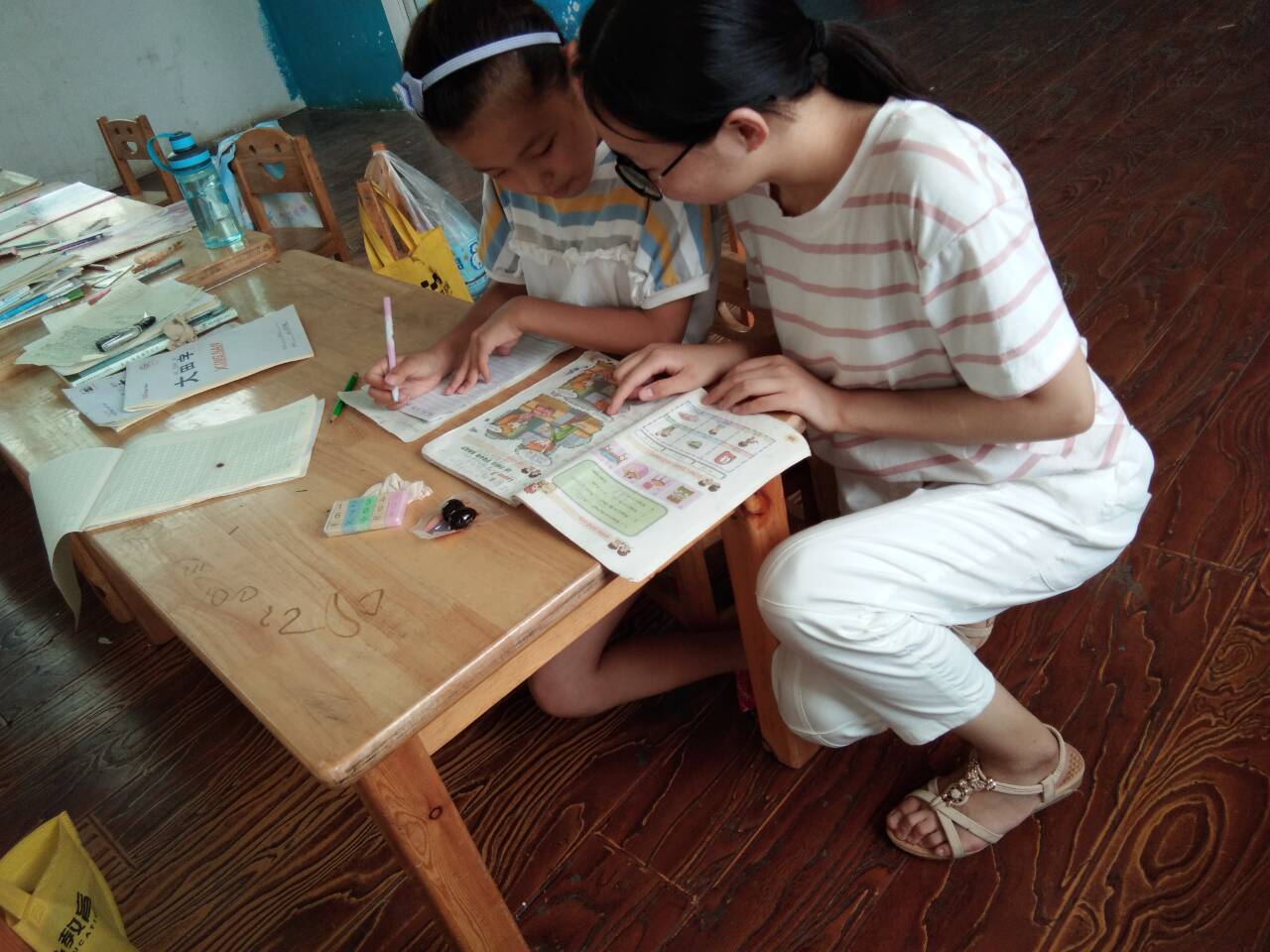 为了尽快融入当地的留守儿童,支教团成员先与留守儿童做游戏。第一个游戏是掰手腕。两两结合,分出胜负,以此活跃气氛,激发小朋友们的兴趣;第二个游戏是成语接龙,将同学们分为两队,根据老师指定的一个成语,第一个成语的尾字为第二个成语的首字,一直接下去,哪个组用最少的词语接回第一个成语的首字为胜。游戏中小玉小朋友表现尤为突出,反应灵敏,即使会出错,她也不退缩,全程积极参与,她的表现也带动了其他小伙伴们积极参与游戏中。这个游戏不但可以让孩子们积累词汇量还增加了同学们的自信心。支教团成员们也积极参与到游戏中,与孩子们一起比赛,加强师生间交流。游戏结束后,按照与孩子们商定的课程计划对孩子们的功课进行一对一的辅导。功课辅导间隙,支教团老师们还为孩子们精心准备了“情感课”,如在支教团成员张译文老师的“绘画课”上,张老师引导同学们用画笔画出自己最想和父母一起做的事情并解读绘画。同学们拿起画笔画出了自己心愿,并敞开心扉说出了自己藏在心中的小秘密。讲课过程中,张老师为孩子们讲述了父母在外打拼的不易,希望孩子们能够学会理解并积极乐观的生活。