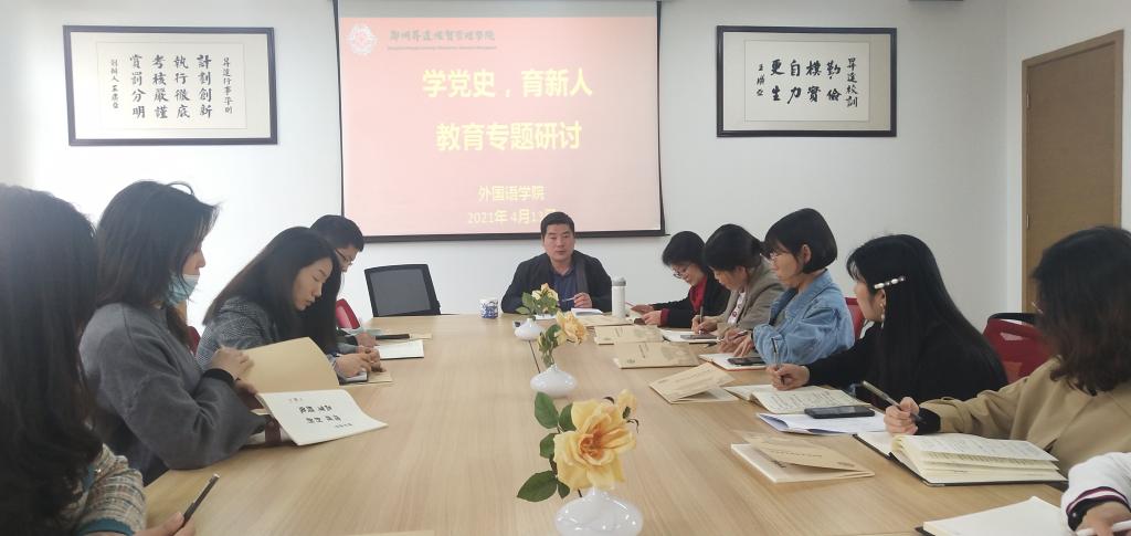 为深入贯彻校党委“党史学习教育”工作的各项部署,进一步推进外国语学院学院的党史学习教育工作开展,4月13日下午15:00,外国语学院党总支在教一楼206会议室召开了“学党史,育新人”教育专题研讨会,会议有外国语学院党总支书记石皓召同志主持,行政秘书惠凯赟同志以及全体辅导员参加了本次会议。