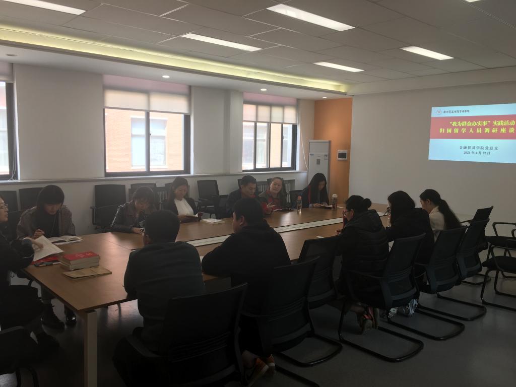 4月22日,金融贸易学院在教学3号楼212会议室开展“我为群众办实事”实践活动归国留学人员调研座谈会。学院党总支统战委员张阳、党总支统战专员和学院全体归国留学人员参加了本次调研座谈会。