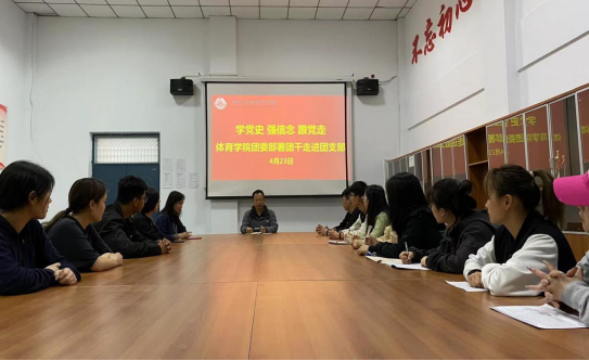 为了贯彻落实学校团委“学党史、强信念、跟党走——团干走进团支部”工作,4月23日中午,体育学院团委在体育馆会议室召开专题会议。会议由学院团委书记高建涛老师主持,团委副书记郭建菊、全体辅导员以及团学骨干参加了此次会议。