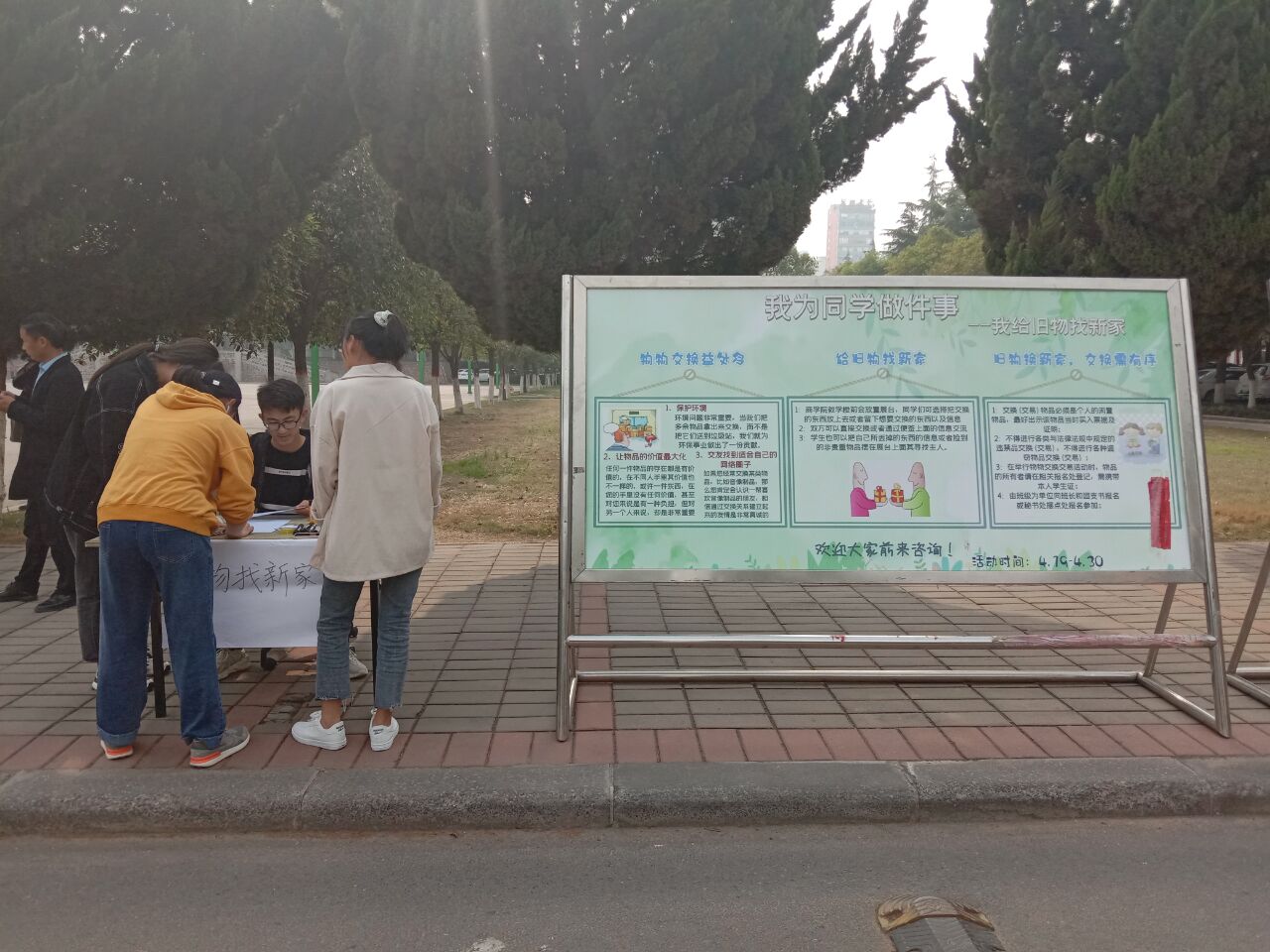 为实现旧物再利用,变废为宝,节约有限资源,使学生能够处理于己无用而又丢之可惜的物品,提高资源的利用率,真正做到将物品的实际价值最大化,商学院特于4月19至4月30日开展物物交换活动于图书馆对面的明德广场顺利举办,我校学生积极报名并参与了此次活动。