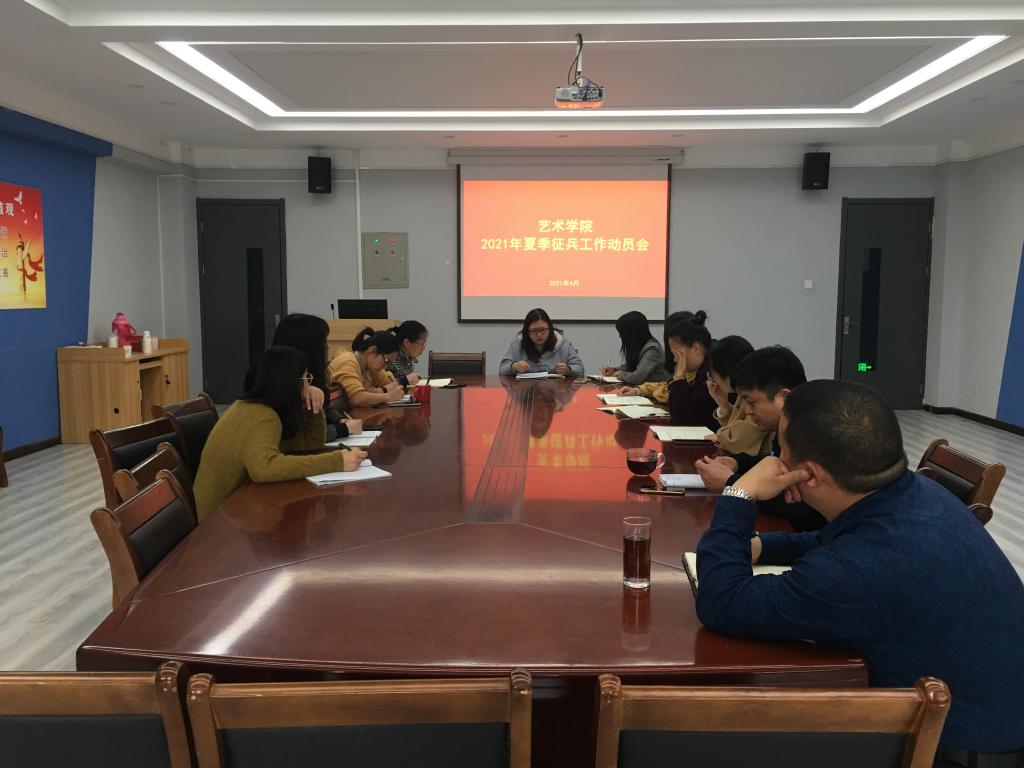 为顺利推进艺术学院2021年夏季征兵相关工作,4月21日下午一点半,艺术学院在艺术楼411会议室召开2021年夏季征兵工作动员会,会议由艺术学院行政秘书尹红艳主持,相关辅导员老师参加了此次会议。