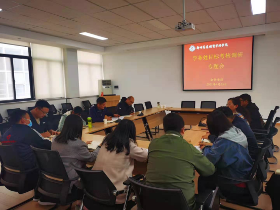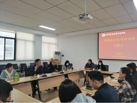 4月25日下午,学务处处长张红阳、生辅科科长孙鹏、宿管科科长张弛、心理健康教育中心科长尚瑞丽一行莅临会计学院开展二级学院目标管理考核体系专题调研,会计学院党总支书记张蕾、行政秘书兼团委书记陈刚、行政秘书刘锦,以及学务工作专员、各年级各学制辅导员代表参会。