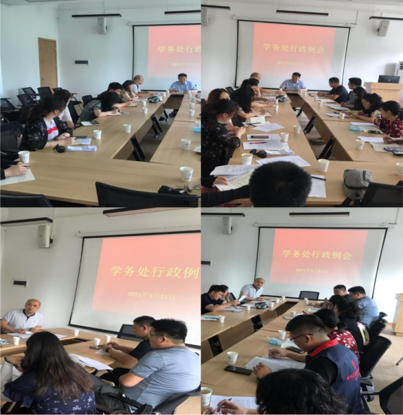 2021年5月31日,第十四周学务处行政例会在教学二号楼商学院315会议室顺利召开。参加会议的有学务处张红阳处长、生辅科孙鹏科长、宿管科张弛科长以及各学院行政秘书。