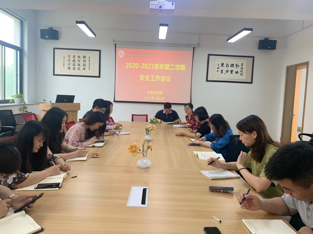 2021年6月1日上午8:30,外国语学院在1号教学楼206召开本学年第二学期安全工作会议。外国语学院党总支书记石皓召同志主持本次会议,外国语学院行政秘书、全体辅导员参加了本次会议。