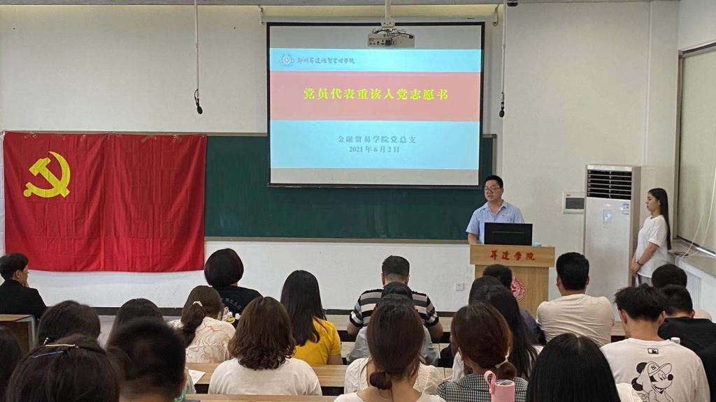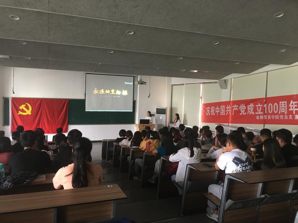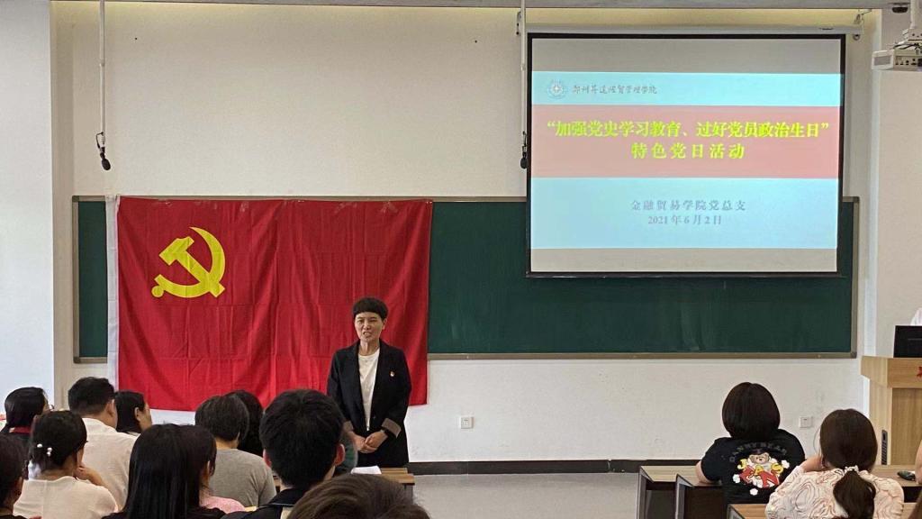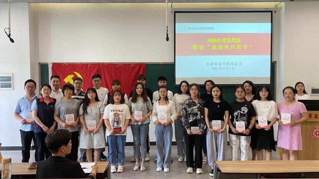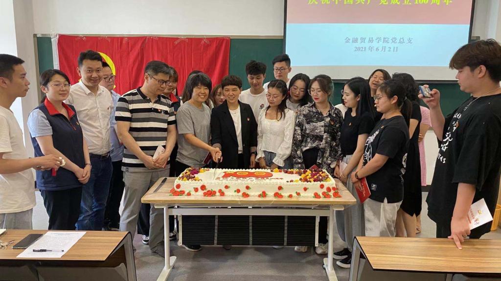 2021年是中国共产党成立的100周年。按照学校和学院《党史学习教育工作方案》和学校《关于做好庆祝中国共产党成立100周年宣传工作的通知》精神,金融贸易学院党总支结合实际,于2021届毕业生即将离校之际,6月2日中午,在教学3号楼210室组织“加强党史学习教育、过好党员政治生日”特色党日活动。学院党总支书记钟江鸽、党总支委员张阳、王娟、李雷、丁玥、全体党支部书记、党支部组织委员、党支部宣传委员和学院党龄满一年的师生党员代表、本期转正的学生党员代表出席了本次活动。
