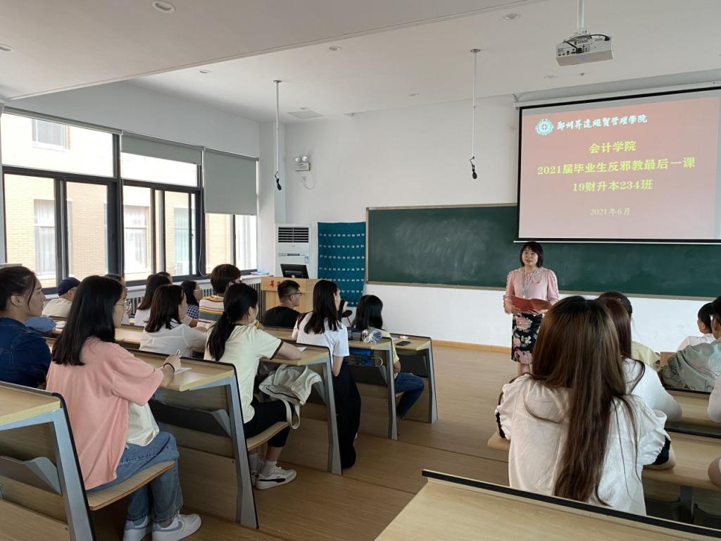 2021届毕业生即将毕业离校, 为了使青年大学生在毕业之后仍然能够提高识邪防邪意识,增强反邪教能力,会计学院毕业班召开了反邪教最后一课主题教育班会。