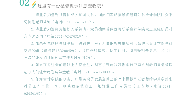 毕业有期限,但会计学院的所有教师对毕业生的服务无期限。为了毕业以后,“江湖”再相见,会计学院的团学组织贴心为即将毕业的学子们整理出一份联系清单。即使学子们毕业后迈出达园,在其需要时,会计学院对大家的牵挂和留恋一如往常。无论何时,只要学子们需要,我们都在!