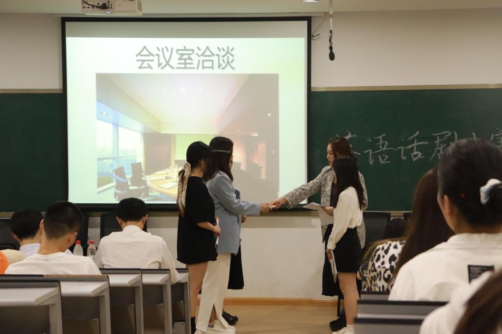 活动开始,两位主持人中英文主持拉开了比赛帷幕。七组话剧表演队伍根据提前抽签的顺序依次上场演出,首先出场的《海盗谈判》营造出热情氛围,接着《后妈茶话会》《睡美人》中精致的道具,熟练的台词深入人心,《中国合伙人》《商务洽谈》《Long Time No See》流畅的节奏,传神的演技,让观众们看得津津有味,选手们精彩的表演赢得现场一阵又一阵的掌声。六组队伍全部表演结束,主持人宣布比赛结果,一等奖:《中国合伙人》,二等奖:《睡美人》《后妈茶话会》,三等奖:《海盗谈判》《商务洽谈》《Long Time No See》《商务英语价格谈判》。最后获奖队伍上台领奖并和评委老师合影留念。