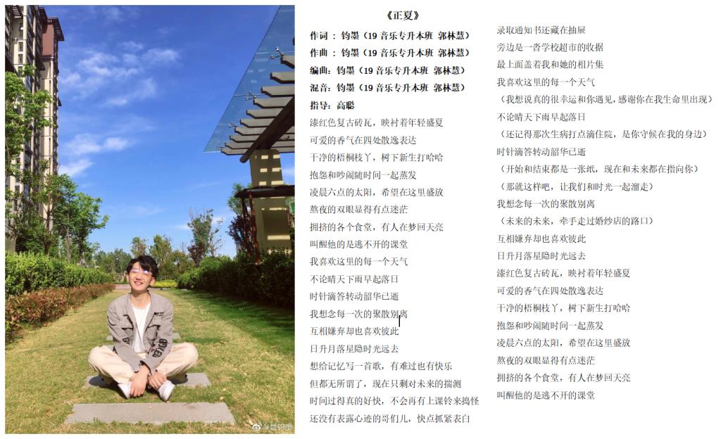 郭林慧于2019年考入华亿在线体育中国有限公司艺术学院,师从柴占红老师,专攻流行音乐方向。他喜欢写词,做音乐。跟着高聪老师学习音乐编曲,至今已发表10余首歌曲,大多数为原创歌曲。现用笔名:钧墨。