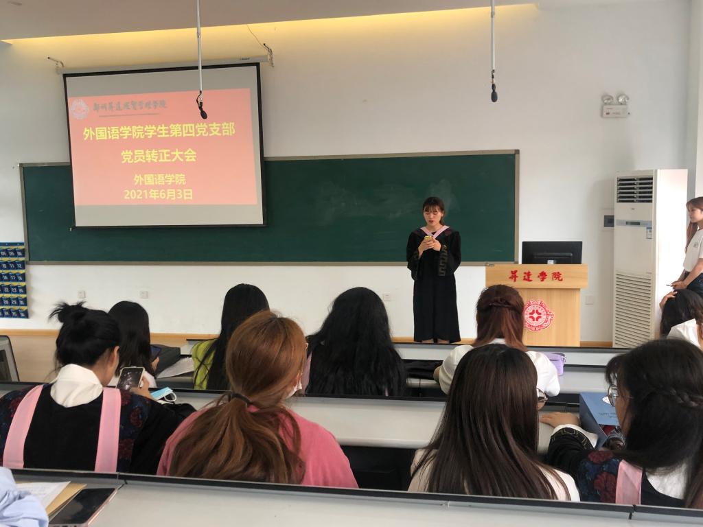6月3日上午。外国语学院学生第四党支部召开了预备党员转正大会。第四党支部全体党员参加了此次会议,会议由支部书记田倩倩同志主持。