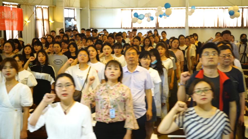 毕业生代表石孟欣同学发言并带领全体毕业生宣誓:“身为文法学子,必当秉承‘文蕴千秋浩气,法济万世民生’的精神,树立远大理想,热爱伟大祖国,担负时代责任,勇于砥砺奋斗,练就过硬本领,锤炼品德修为,为中华民族之伟大复兴而努力奋斗!”快闪环节把全场气氛带到高潮,学弟学妹们手捧红烛进入会场,和张甜梦、王卫丽、王松洁三位毕业班辅导员老师一起为全场2021届毕业生倾情献唱欢送歌曲《再见》。歌曲尾声,播放了院领导、任课教师和辅导员老师们提前精心录制的寄语视频。最后,全体院领导和老师起立列队,目送全体毕业生离场,毕业生纷纷流下依依不舍的泪水,与老师拥抱告别。(供稿人:张喜超、张帆 供图:文法学院团委学生会)