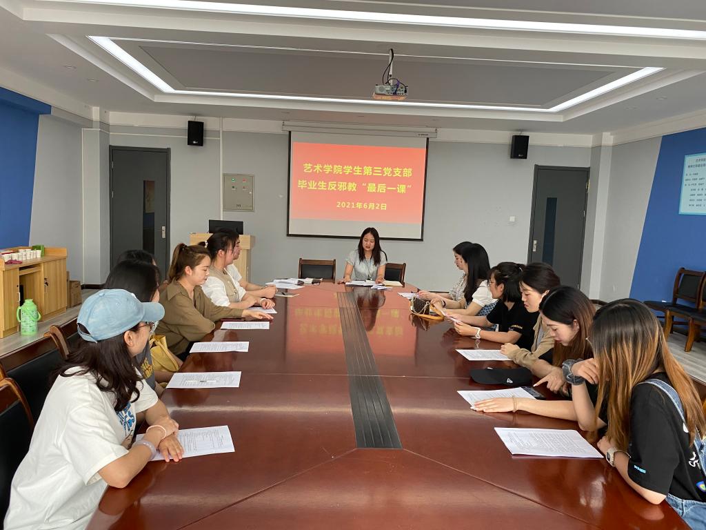 “崇尚科学,反对邪教”,是我们日常教育中的一项重要内容。为进一步强化毕业生党员的自身责任意识以及反邪防邪意识,艺术学院学生第三党支部于2021年6月2日在艺术楼411会议室召开了毕业生反邪教“最后一课”,党支部全体毕业生党员同志参会,宣传委员王丽丽主持。