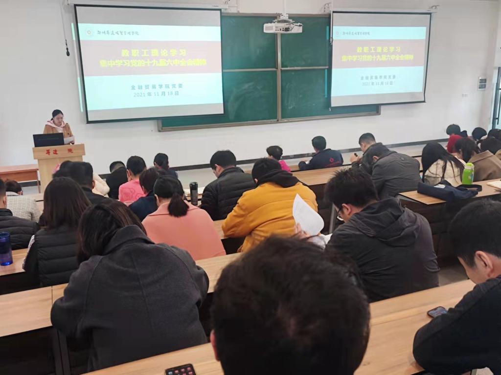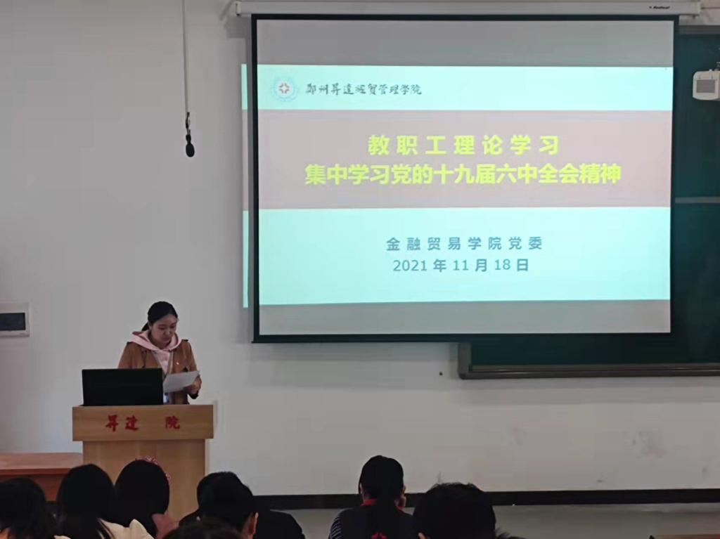 按照学校2021年度教职工理论学习安排、学校和学院党史学习教育实施方案、学院党委理论学习工作计划,金融贸易学院教职工理论学习会暨党的十九届六中全会精神学习会于11月18日下午在3号教学楼107教室召开。院长何伟、党委书记钟江鸽、副院长杨毅、教学秘书张阳、行政秘书王娟及全体教职工参加了本次会议,会议由党委委员、组织员李雷主持,由经济学专业学生党支部书记曾婧婧领学。