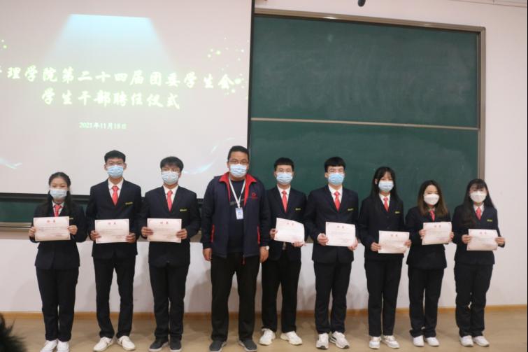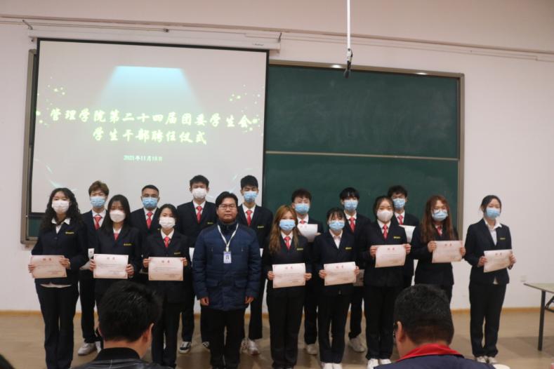 随后团委常务副书记马超老师宣读管理学院第24届团学会学生干部的任命通知,并为新一届部长颁发聘书并合影留念。