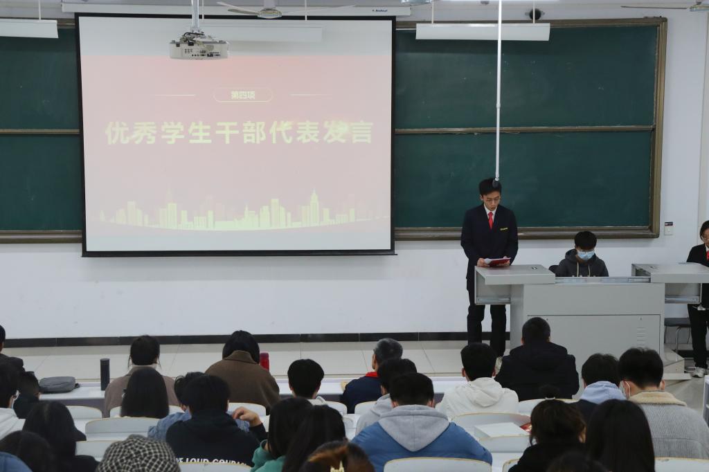 随后,获奖学生代表刘国才同学上台发言。刘国才同学讲到:希望同学们在学生工作中不断完善自我、磨练自我、施展自我,蜕掉稚嫩,逐步走向成熟;也相信只要我们团结一致,在一个崇高信念的支持下,不停的工作,即使慢,也一定会获得成功;希望学院首届学生会充满温馨和爱意、洋溢着朝气蓬勃的生气,创造更璀璨的辉煌!