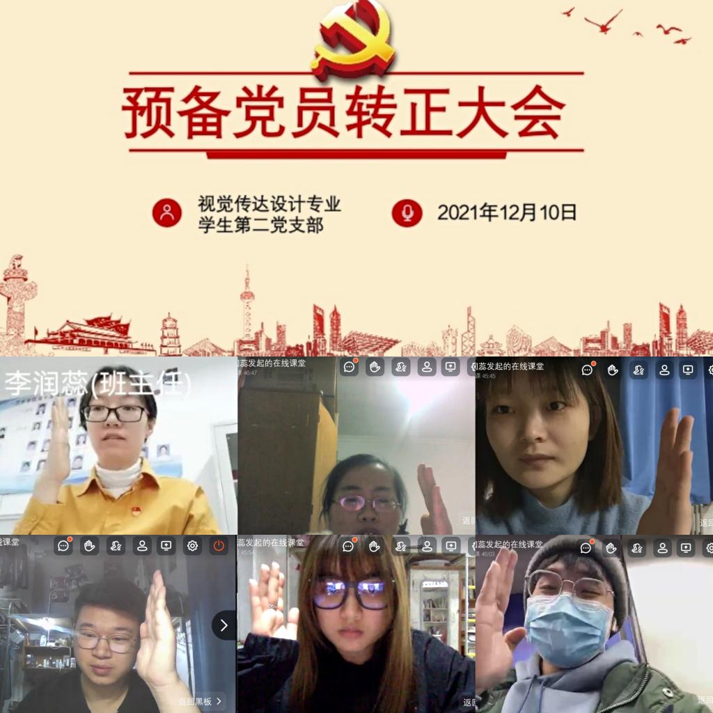 2021年12月10日晚6点,艺术学院视觉传达设计专业学生第二党支部召开预备党员转正大会。支部全体党员参加了此次转正大会,大会由支部书记李润蕊主持。由于特殊时期,本次支部大会采取钉钉线上会议的方式,为离校实习的毕业生党员们提供了便利。