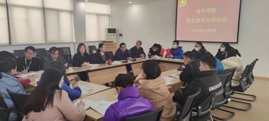 为进一步加强基层党组织建设,提升业务水平,12月9日下午3:00,会计学院党委于4号楼209会议室召开党支部书记培训会。学院党委书记张蕾,党委委员、副院长张新成,组织员林方与全体党支部书记参加了本次培训。