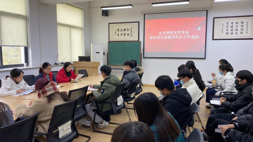 为进一步推动全体党员深入学习领会党的十九届六中全会的重大意义、精神实质、实践要求,提高党员同志在新形势下意识形态工作的能力,文法学院法学专业学生党支部于2021年12月11日中午在教学一号楼314会议室召开意识形态工作会议。本次会议由文法学院学生党支部书记王松洁主持,全体师生党员参加。