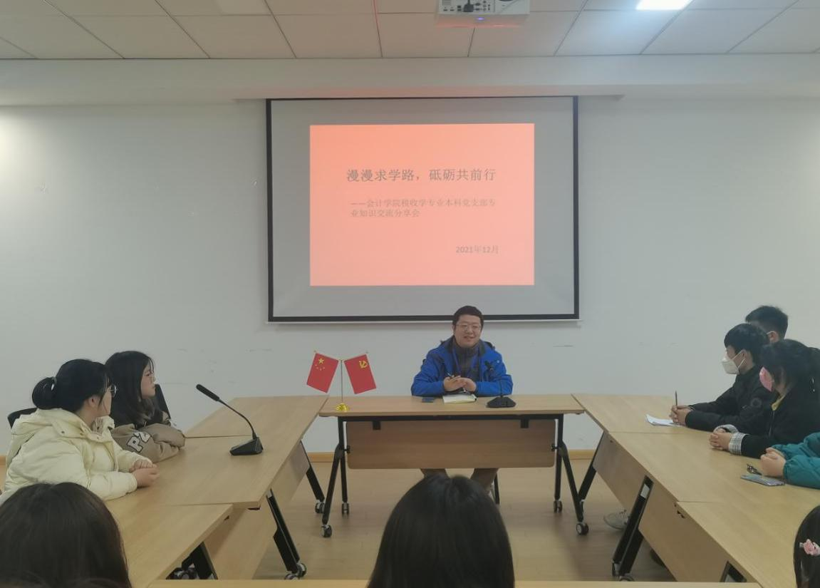 为落实立德树人根本任务,推动党建工作与专业建设进一步融合,发挥党员示范作用,12月11日下午14:00,会计学院税收学专业本科党支部在四号教学楼209室组织开展“漫漫求学路,砥砺共前行——税收学专业学习交流分享会”主题活动。会议由支部书记许震主持,全体党员和入党积极分子参会。