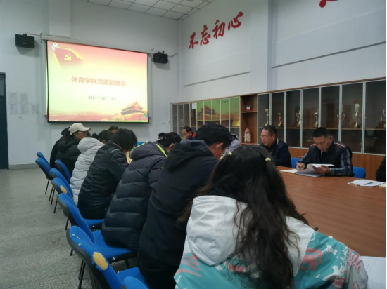 为进一步贯彻落实省教育厅及学校对疫情防控工作的安排部署,做好学期期末相关工作,12月13日下午,体育学院在体育馆会议室召开党政联席会,体育学院党总支书记杨明志主持会议,全体总支委员、支部书记、辅导员和部分教师代表参加会议。