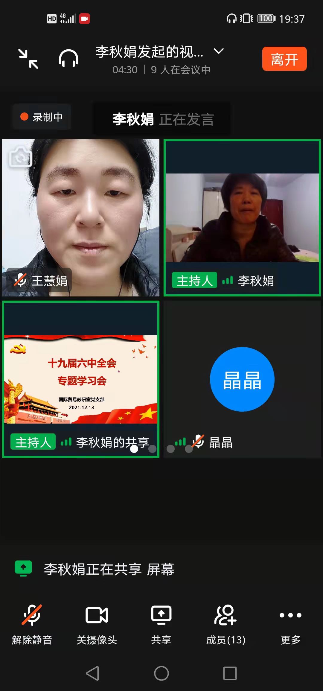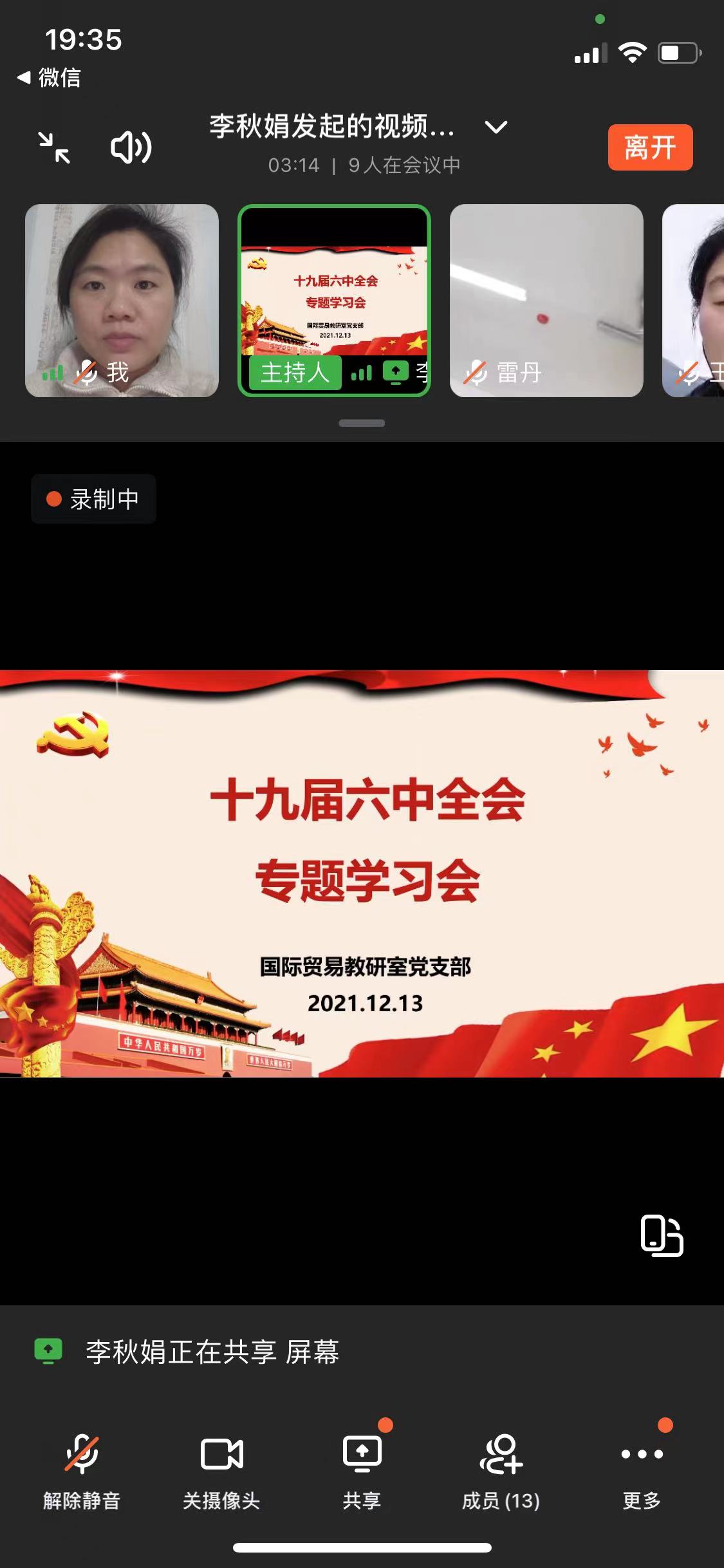 2021年12月13日晚上7点半,金融贸易学院国际贸易教研室党支部组织学习十九届六中全会精神,会议在钉钉线上进行,由支部书记李秋娟主持,全体党员教师参会。