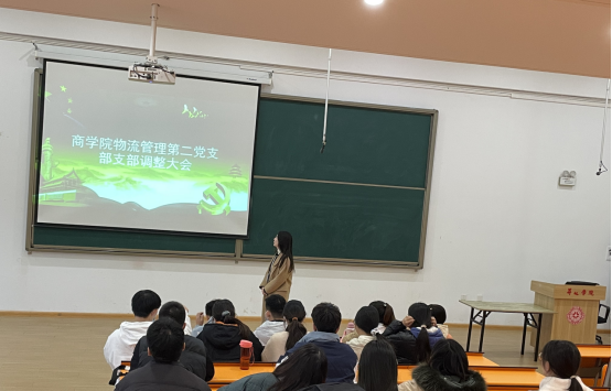 吴晓芳同志首先宣读了关于商学院物流管理学生第二党支部支部调整的相关文件。由于人数过多,不方便开展支部活动,经院党委审批,决定对物流管理学生第二党支部进行调整。调整后,支部由三名正式党员和16名预备党员构成,由于正式党员人数较少,不设置支部委员会,任命李培同志担任支部书记。