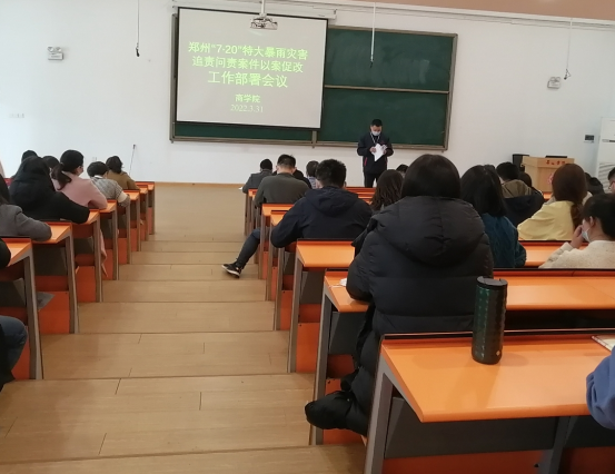 3月31日下午,商学院在二号教学楼116教室召开郑州“7·20”特大暴雨灾害追责问责案件以案促改工作部署会议,学院领导班子及全体教职工参加会议。商学院党委书记郭峰主持会议。