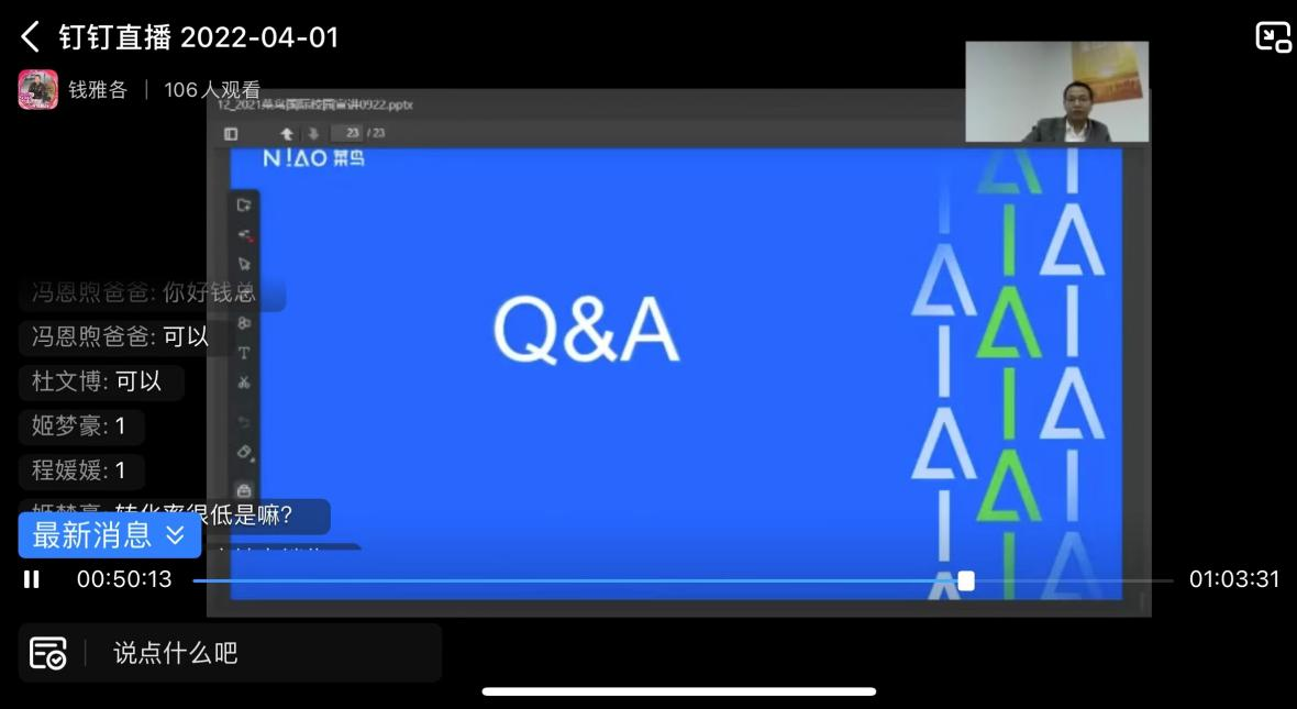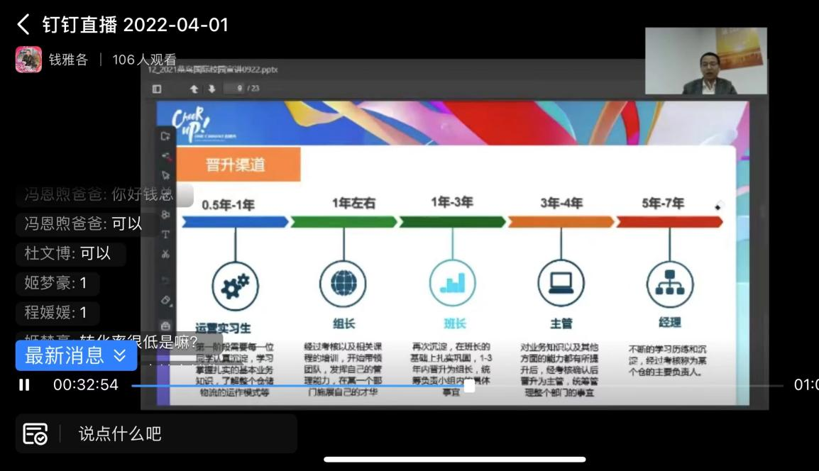 随后由阿里巴巴菜鸟国际供应链全国招聘配置高级经理钱雅各开启招聘直播宣讲。直播过程中,他向同学们详细介绍了菜鸟国际供应链的业务范围、具体招聘岗位、晋升渠道、薪酬水平、员工食宿以及文化活动项目等。最后,钱总在直播间设置了答疑环节,我校毕业生积极向钱总提问,互动良好,钱总耐心向我校学生解答岗位加班情况、休假情况、工作氛围等相关问题。