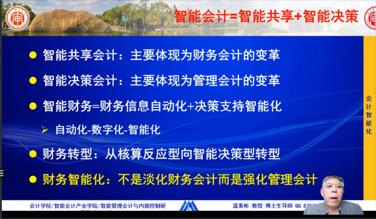 南京审计大学会计学院院长温素彬教授在演讲中介绍了会计智能化人才培养的三种境界:优术,打造好大数据、智能化的技术;明道,掌握会计智能化的一般规律和体系架构;取势,洞察会计智能化的未来发展趋势。他认为,高质量会计需要新技术(数)和管理智慧(智)的赋能,财会始终随着技术的升级而变革,智能会计等于智能共享加智能决策。同时还分享了南审会计智能化的五大保障措施、两育三元四融的人才培养模式、“一体两翼四协同”教学实施体系的内容和举措。研讨会上来自新道科技股份公司财经事业部总经理眭召强进行了《数智时代财会人才培养的校企创新行动与实践》主旨演讲。