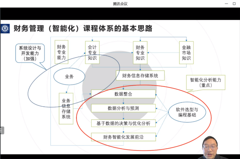 上海财经大学会计学院副院长朱凯教授在演讲中分析了财会职业的智能化发展趋势和不同级别财会岗位职责特点,详细介绍了上海财经大学财务管理(智能化)课程体系的基本思路,提出系统设计与开发能力要加强,智能化分析能力是重点,而这些课程的开设需要软件选型与编程基础。他表示,上财课程体系中强调了专业及融合课程,智能化技术及融合课程。