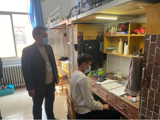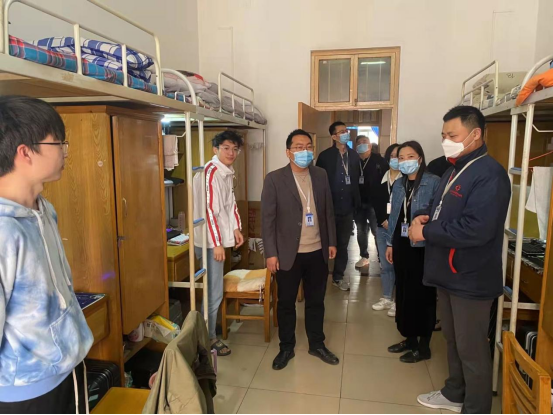 在学生宿舍,院党委书记郭峰和副院长白朋飞指出,当下疫情形势严峻,根据上级疫情防控工作要求,学校第一时间启动应急预案,实行校园封闭式管理、组织全员核酸检测、开展线上教学、储备防疫物资、开展全校园消杀等,全力保障同学们的身体健康和生命安全。