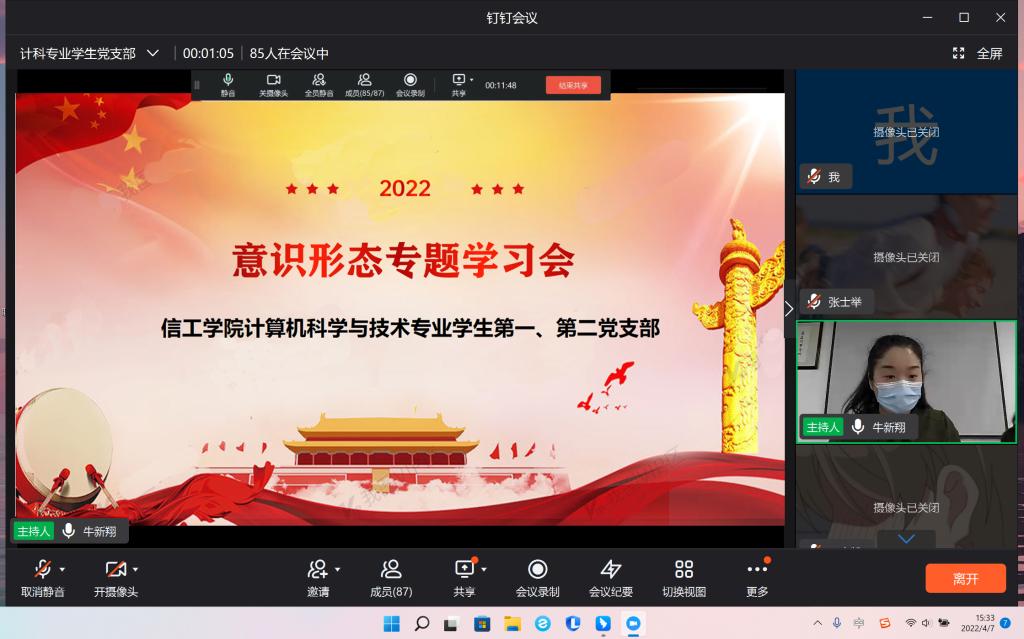为进一步强化意识形态工作,2022年4月9日,信息工程学院计算机科学与技术专业学生第一、第二党支部通过线上集中学习“建设具有强大凝聚力和引领力的社会主义意识形态”,第一、第二支部全体党员、预备党员、积极分子参加本次会议,会议由第一支部支部书记牛新翔同志主持。