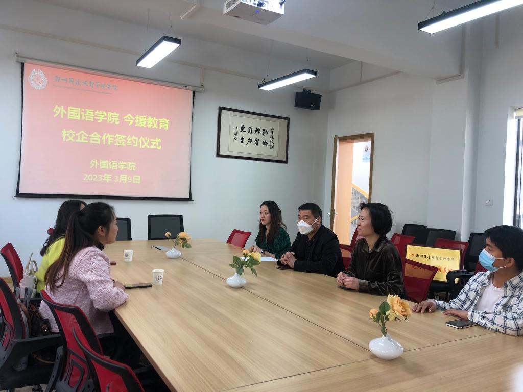 为了深化产教融合、校企合作,促进校企之间的沟通交流,外国语学院于2023年3月9日,在教学一号楼206会议室,与新郑今援教育培训中心举行校企合作签约仪式。外国语学院院长崔瑾英、院党委书记石皓召及2023届毕业班辅导员出席了此次签约仪式。