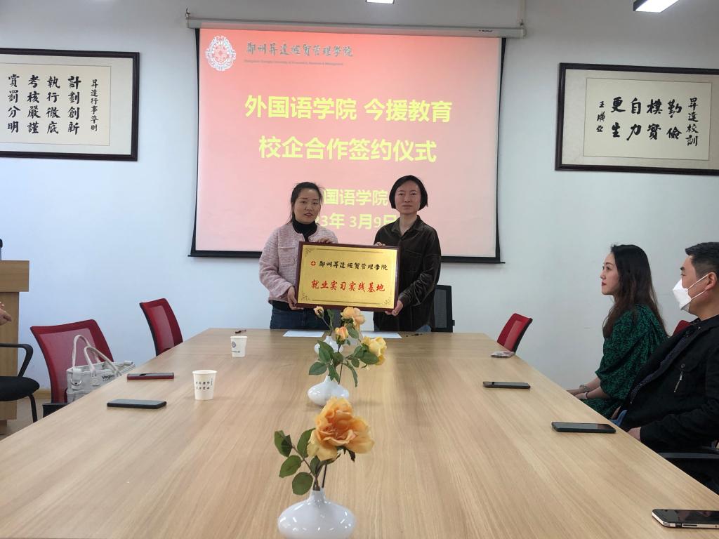 签约仪式上,崔院长简要介绍了学院的学科发展、专业建设、人才培养等情况,就公司对学院的信任表示感谢,就双方合作前景提出希望并给予美好祝愿。今援教育教学校长黄妍闵、今援人事经理郭晓利介绍了公司的情况,对学院的学科专业实力给予充分肯定,希望能在原有交流的基础上深入合作,发挥双方优势、互惠双赢。双方签署了《大学生就业实习实践基地的协议书》。