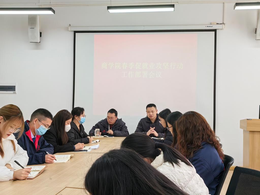 3月20日下午,商学院在315会议室召开春季促就业攻坚行动工作部署会议。参加会议的有商学院党委书记郭峰、副院长白朋飞及我院部分教职工。首先,郭书记对于《教育部办公厅关于开展2023 届高校毕业生春季促就业攻坚行动的通知》(教学厅函〔2023〕3 号)的文件精神进行了传达,并要求我院行政领导、教研室主任等都要参与到我院春季促就业攻坚行动中,开拓更多优质企业和就业岗位,力求与用人单位达成长期合作机制,确保专项行动取得实效。