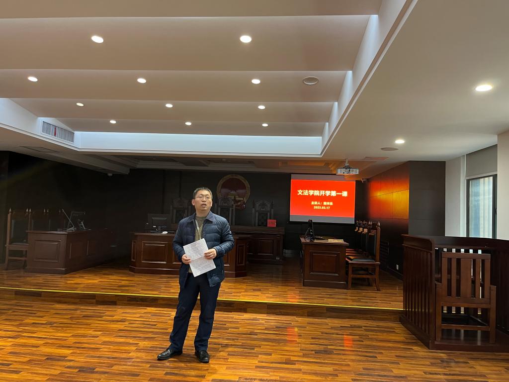 为进一步提高文法学院法学专业学生的法律素养,增强学生学法懂法知法的法律意识,深入理解党的二十大精神,3月17日上午,文法学院院长段丰乐深入学生班级,结合二十大报告为同学们上了一堂精彩的新学期第一课。