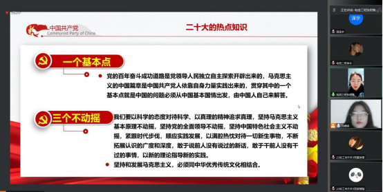 大会内容主要分为两大部分:重温二十大热点知识,并由支部成员现场对二十大精神进行深入解读,同时在冯煜婷老师的带领下同各党员同志进行指正和补充;听取党员同志对近期的思想以及日常生活情况的汇报,并结合实际给予指正。